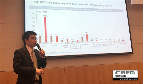 圖為中國·動力電池應用分會秘書長、電池中國網CEO張雨發表演講