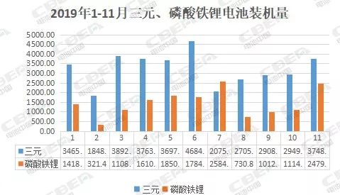 據電池中國網了解,由于11月新能源客車裝機量大幅增長,使得磷酸鐵鋰裝機量環比大增122.55%,達到2.48GWh,進而也使得11月磷酸鐵鋰裝機市場占比達到39.45%,較10月環比上升12%;三元電池11月裝機量3.75GWh,環比增長了27.07%,市場占比達59.63%,環比減少12%。