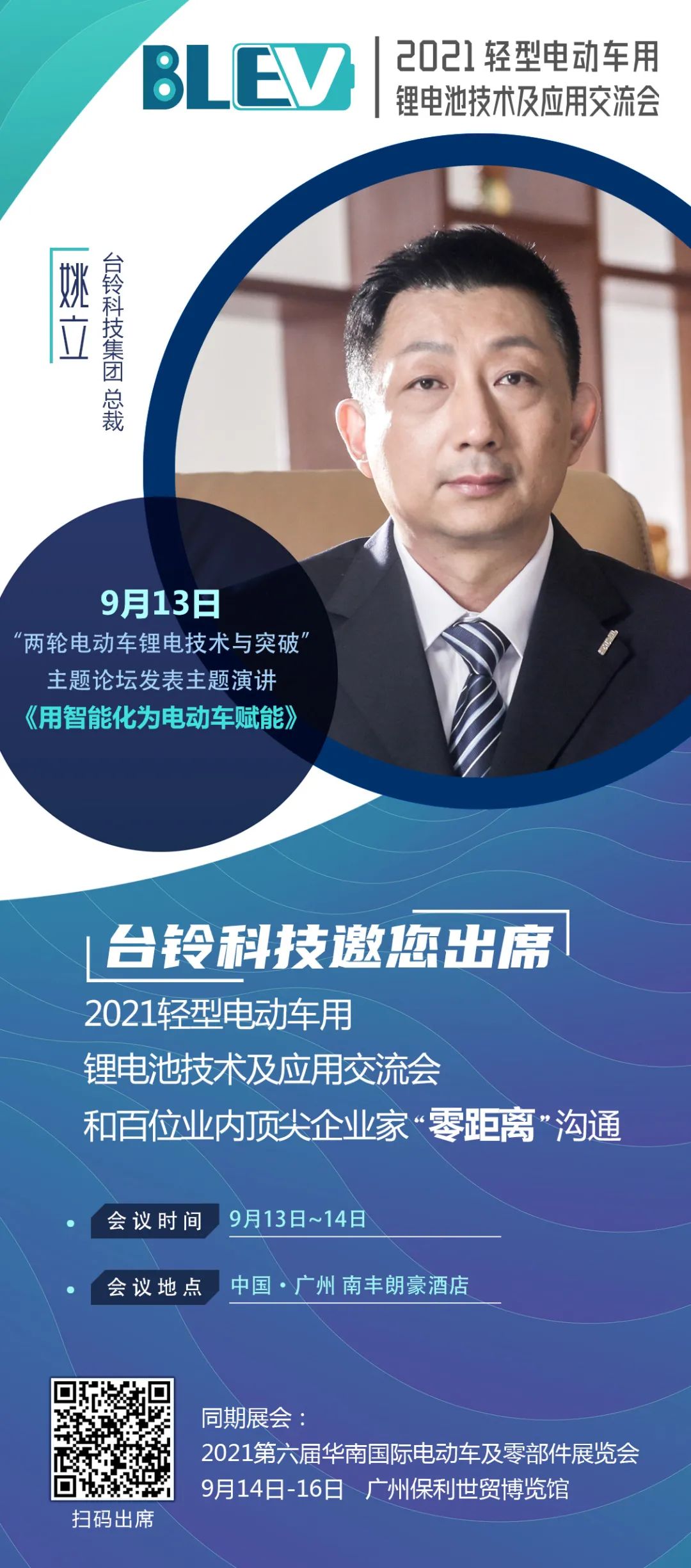 9月13-14日,深圳臺鈴科技集團有限公司總裁姚立,應邀將出席在廣州舉行的“2021輕型電動車用鋰電池技術及應用交流會”,并發表關于“用智能化為電動車賦能”的主題演講,敬請期待。