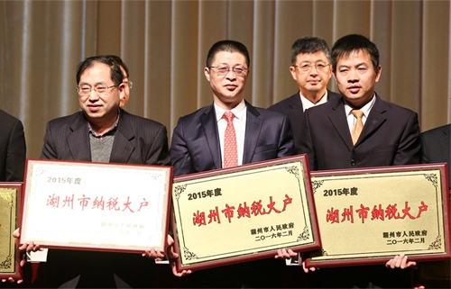 周明明董事長(中)從市長陳偉俊手中接過湖州市納稅大戶獎牌