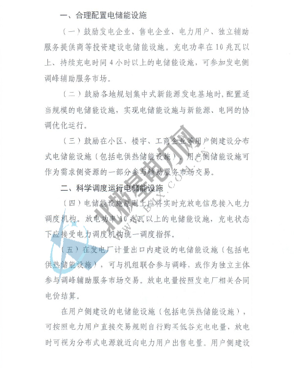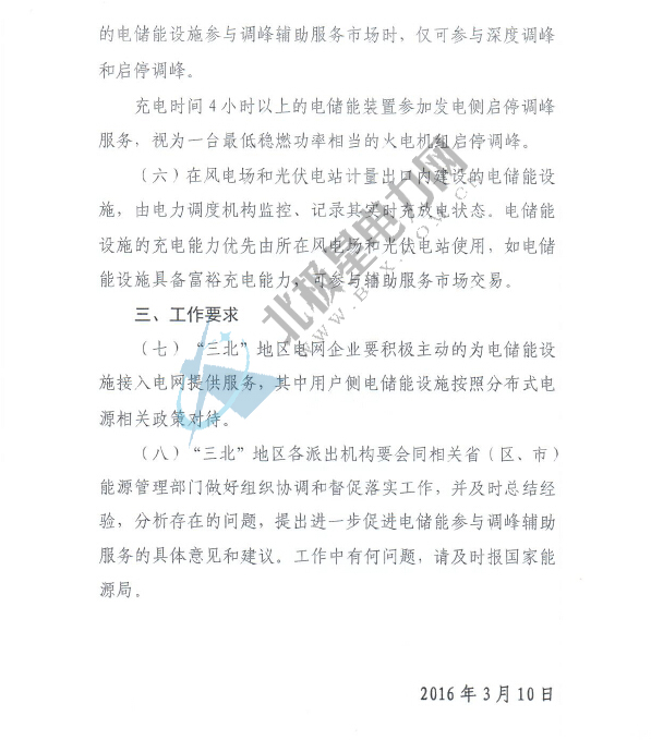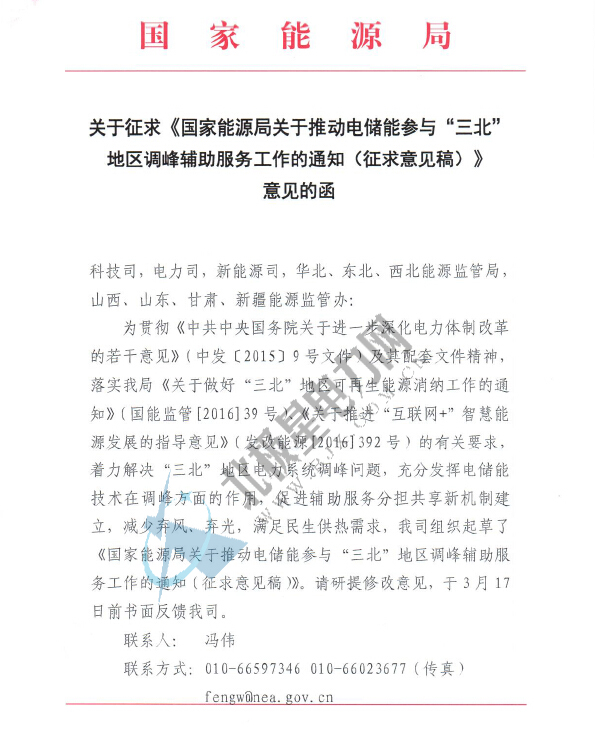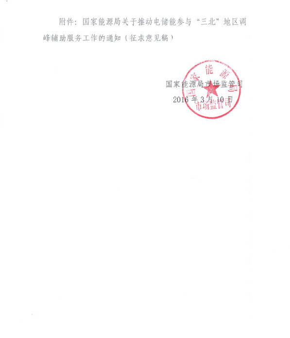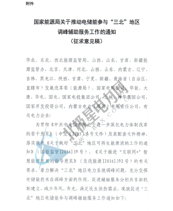 國家能源局關于電儲能參與“三北”地區調峰輔助服務工作的通知(征求意見稿)