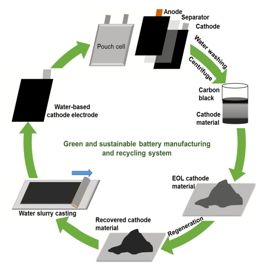 研究人員發現,通過水基工藝制造的電極與傳統基于溶劑工藝制造的電極的速率性能和循環壽命相當。利用水溶性粘合劑能夠利用水,從廢電極中回收陰極化合物,成功再生此類化合物后,新電極與原始電極電化學性能相當。