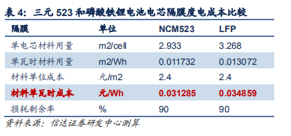 三元和磷酸鐵鋰電池隔膜的度電成本較為接近,三元為 31.29 元/ kWh,磷酸鐵鋰的為 34.86 元/kWh,區別同樣在于磷酸鐵鋰電池能量密度較低導致材料用量多于三元。