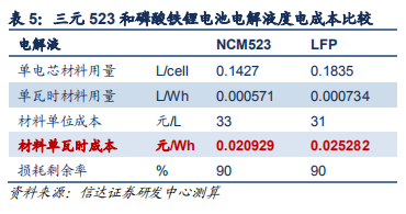 電芯材料中電解液占比較隔膜略低。三元 523 電解液的度電成本為 20.93 元/kWh,磷酸鐵鋰為 25.28 元/kWh。