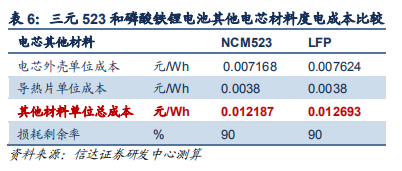 除以上外,電芯其他成本主要還包括外殼和導熱片,整體占比較低。三元 523 和磷酸鐵鋰電池其他電芯材料的度電成本分別為 12.18 和 12.69 元/kWh。