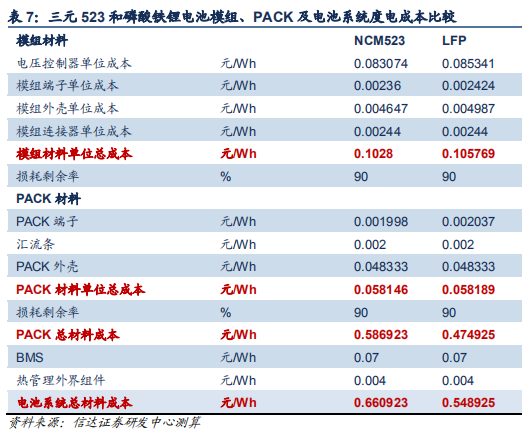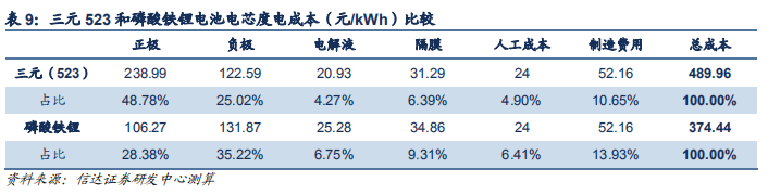 僅考慮電芯的情況下,三元 523 和磷酸鐵鋰電芯的度電成本分別為 486.96 和 374.44 元/kWh。