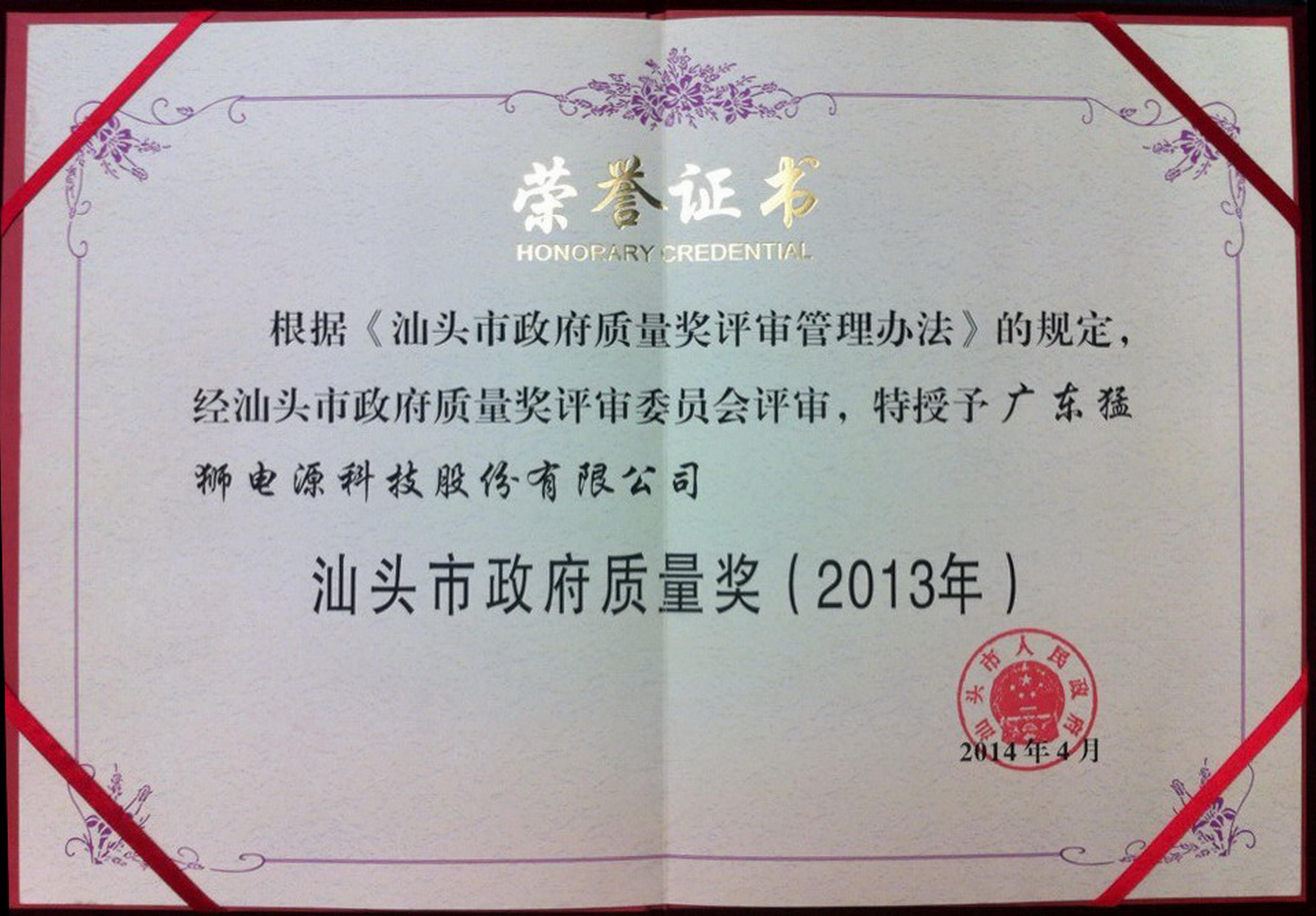 日前,首屆“汕頭市政府質量表彰會議”在廣東汕頭舉行。廣東猛獅電源科技股份有限公司(以下簡稱猛獅科技)等三家企業(yè)榮獲首屆“汕頭市政府質量獎”。