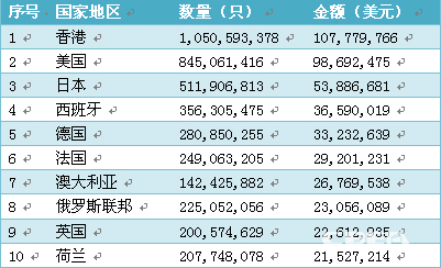 2013年,我國圓柱堿錳電池出口的前十大國家和地區分別為香港、美國、日本、西班牙、德國、法國、澳大利亞、俄羅斯聯邦、英國和荷蘭。其中,向香港地區的出口量和金額均排名第一,出口量為1,050,593,378只,出口金額為107,779,766美元。
