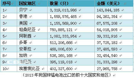 2013年,我國(guó)鋅錳電池出口的前十大國(guó)家和地區(qū)分別為貝寧、香港、美國(guó)、坦桑尼亞、阿聯(lián)酋、多哥、安哥拉、加納、肯尼亞、埃塞俄比亞。其中,共出口貝寧共和國(guó)3,319,013,986只鋅錳電池,出口金額143,844,185美元。