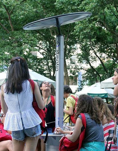最近紐約市Bryant公園里就出現了一種名為CityCharge的太陽能手機充電樁,可以讓路過的游客隨時為手機充電。