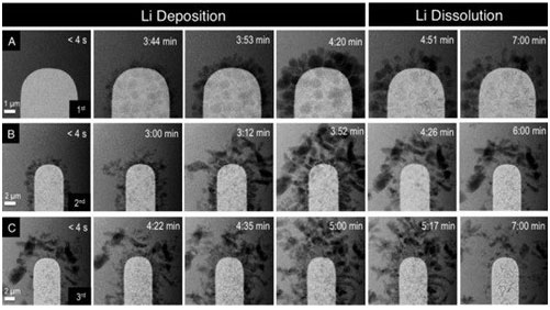 在圖中,鋰(圖中黑色細毛狀物體)在每個放電周期后都會暫時沉積上電極上,但不會完全溶解。如此一來,多次重復(fù)后每次可以利用的鋰就會越來越少,亦即為電量降低。