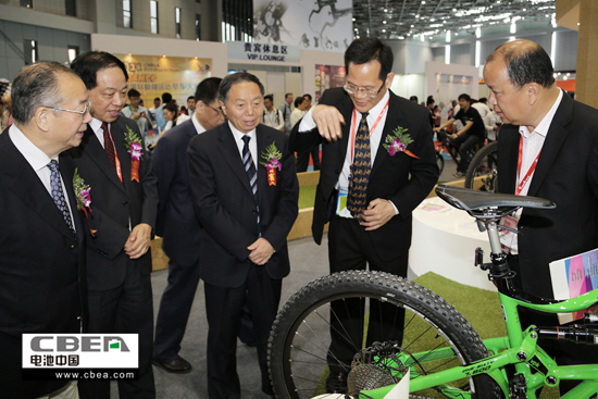 中國輕工業聯合會會長步正發(左三)和中國自行車協會理事長馬中超(左二)等在展臺參觀