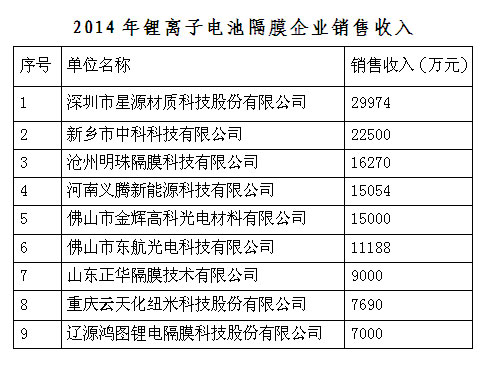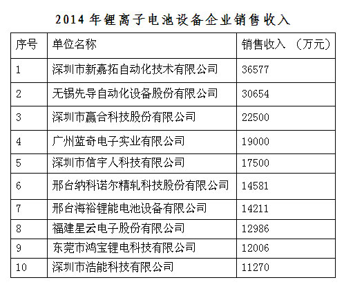 據悉,本次評選以2014年度參評企業產品銷售收入為主要依據,并參考利潤總額、出口創匯額等其他經濟指標綜合排定,“2014年鋰離子電池設備企業銷售收入排名”也同期發布。