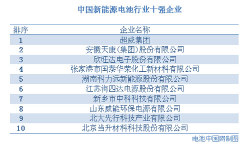 日前,中國輕工業(yè)聯(lián)合會發(fā)布2014年度中國新能源電池行業(yè)十強企業(yè)榜。該榜單由中國電池工業(yè)協(xié)會推薦,由中國輕工業(yè)聯(lián)合會對參評企業(yè)2014年度主營業(yè)務收入、利潤等指標進行綜合評定得出。
