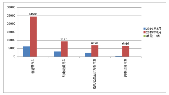 2015年8月,我國新能源汽車生產2.45萬輛,同比增長近4倍。其中,純電動乘用車生產9175輛,同比增長近3倍,插電式混合動力乘用車生產6778輛,同比增長3倍;純電動商用車生產6446輛,同比增長21倍,插電式混合動力商用車生產2142輛,同比增長近1.5倍。列入《免征車輛購置稅的新能源汽車車型目錄》前四批的新能源汽車生產2.16萬輛,占8月產量的88%。