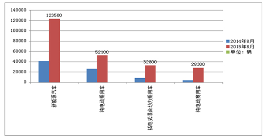 2015年1-8月,新能源汽車累計生產12.35萬輛,同比增長3倍。其中,純電動乘用車生產5.21萬輛,同比增長2倍,插電式混合動力乘用車生產3.28萬輛,同比增長4倍;純電動商用車生產2.83萬輛,同比增長8倍,插電式混合動力商用車生產1.02萬輛,同比增長96%。