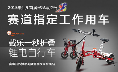 作為“2015年汕頭半程馬拉松賽”賽事合作贊助商,猛獅科技旗下的戴樂(lè)一秒折疊鋰電自行車成為“賽道指定工作用車”,而這款車也是猛獅科技踐行“綠色健康生活主張”的一款時(shí)尚產(chǎn)品。