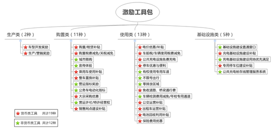 據中國電動汽車百人會研究咨詢部副主任張娟介紹,全球范圍內新能源汽車產業政策可分為生產類、購置類、使用類和基礎設施類四大類別。我國的新能源汽車推廣政策主要集中在購置類和使用類上,涉及到生產類和基礎設施類較少,而在激勵工具方面,貨幣類政策數量占絕大多數。