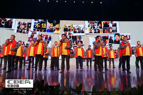 圖為超威集團相關領導與聯營商代表共同演唱《真心英雄》