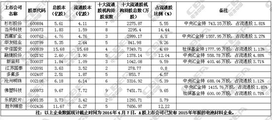 [摘要]截至2016年4月7日收盤,A股上市電池材料企業已公布2015年年報的有13家。根據年報數據顯示,這13家電池材料企業的前十大流通股股東中,均有機構投資者身影出現。
