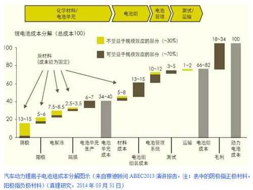 吳輝認為,如果以整個汽車動力鋰電池組成本為100%來看,電池單元成本占到整個電池組成本的34%~40%,其中6%~7%的電池單元生產成本是可以通過擴大生產規模來降低的,剩余的材料成本則比較固定,降低成本的余地不大。在電池到電池組的過程中,電池組裝、電池管理系統、電池組測試乃至組裝材料等的成本均有下降的空間,尤其前兩者的成本下降空間較大。另外,由于前期的研發投入要分攤到電池的價格中,因此電池組的毛利目前還相對偏高,在18%~34%,這一部分的成本也有很大的下降空間。