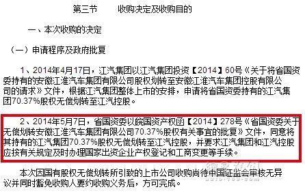 江淮汽車也同時發布關于收到控股股東《關于安徽江淮汽車集團有限公司股權劃轉的通知》的提示性公告2014年5月15日公司收到控股股東江汽集團《關于安徽江淮汽車集團有限公司股權劃轉的通知》),根據安徽省國資委(皖國資產權函【2014】278號)《省國資委關于無償劃轉安徽江淮汽車集團有限公司70.37%股權有關事宜的批復》,安徽省國資委將其持有江汽集團70.37%的股權無償劃轉至安徽江淮汽車集團控股有限公司(簡稱“江汽控股”)。本次股權劃轉行為完成后,江汽控股通過江汽集團間接持有公司35.43%的股份,公司的實際控制人未發生變化,仍為安徽省國資委。