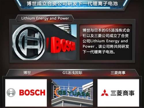 在9月2日的博世技術創新體驗日中,博世集團董事會成員、亞太區負責人泰瑞來表示,博世與日本的GS湯淺株式會社以及三菱公司成立了合資公司,該公司將共同研發下一代鋰離子電池,希望能夠將電池的能效提升一倍。合資公司Lithium Energy and Power中,博世持股50%,GS湯淺國際與三菱商事分別持股25%,董事會也依持股比例組成。