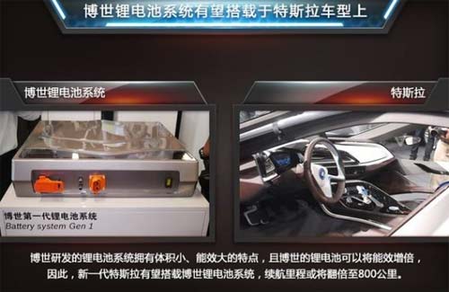 由于特斯拉Model S汽車的熱銷,使特斯拉對鋰電池的需求達到了一個驚人的程度,未來想要保持穩定發展,就必須想辦法解決鋰電池供應量緊張的問題。博世研發的鋰電池系統擁有體積小、能效大的特點,且博世的鋰電池可以將能效增倍,因此,新一代特斯拉有望搭載博世鋰電池系統,續航里程或將翻倍至800公里。