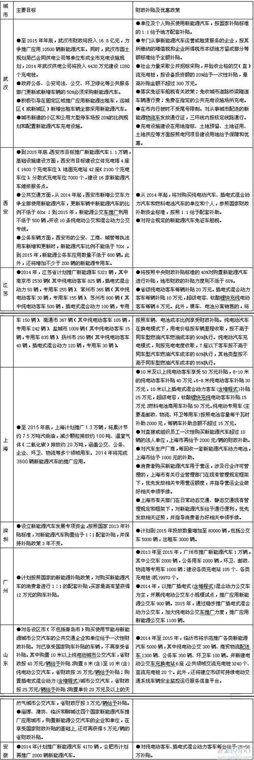 2014年,財政部、科技部、工信部、發(fā)改委(以下簡稱四部委)聯(lián)合發(fā)布新能源汽車補貼標(biāo)準(zhǔn)調(diào)整計劃,并于同期公布第二批新能源汽車推廣應(yīng)用城市名單,全國共有12個區(qū)域的26個城市入圍。隨后,多個省市密集發(fā)布新能源汽車補貼政策細(xì)則,包括新能源汽車推廣目標(biāo)、充換電等基礎(chǔ)設(shè)施建設(shè)規(guī)劃、新能源汽車補貼標(biāo)準(zhǔn)及相關(guān)優(yōu)惠政策等。本文將以商用車為主線,以表格形式對各地關(guān)于新能源政策進(jìn)行了匯總。