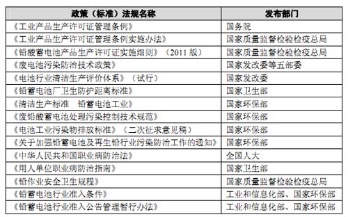 二次電池行業所涉及的法律法規主要包括生產許可和環境保護兩個方面。其中,國家質檢總局負責實施生產許可證制度,鉛酸蓄電池生產過程中的環保不達標被列為關注重點,任何環保設施不健全,或雖有設施、但環境監測不合格的企業均將失去生產該類產品的資格;國家環保部負責行業環保基本制度及各項環保政策、法規和標準的制定和監管;國家衛生部負責職業病防治政策、法規及標準的制定和監管。2012年5月11日,國家工信部和環保部發布《鉛蓄電池行業準入條件》,自2012年7月1日起實施,現有鉛蓄電池及其含鉛零部件生產項目,均應于2013年12月31日前達到本準入條件的要求。相關政策法規具體如下: