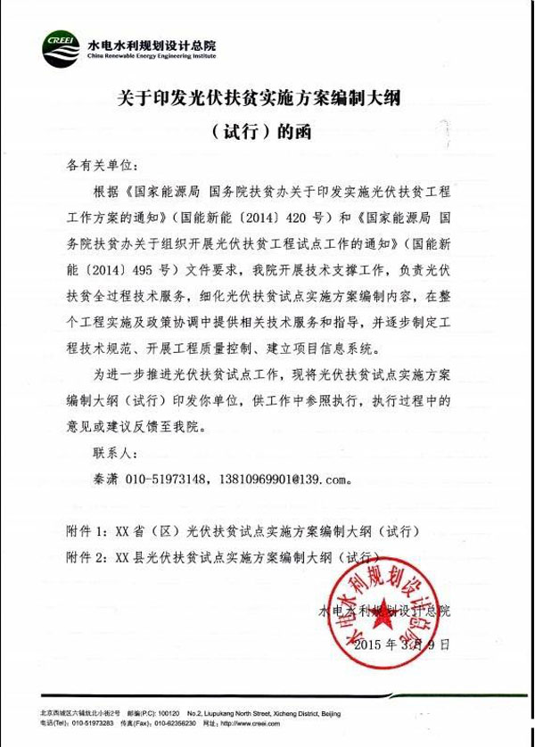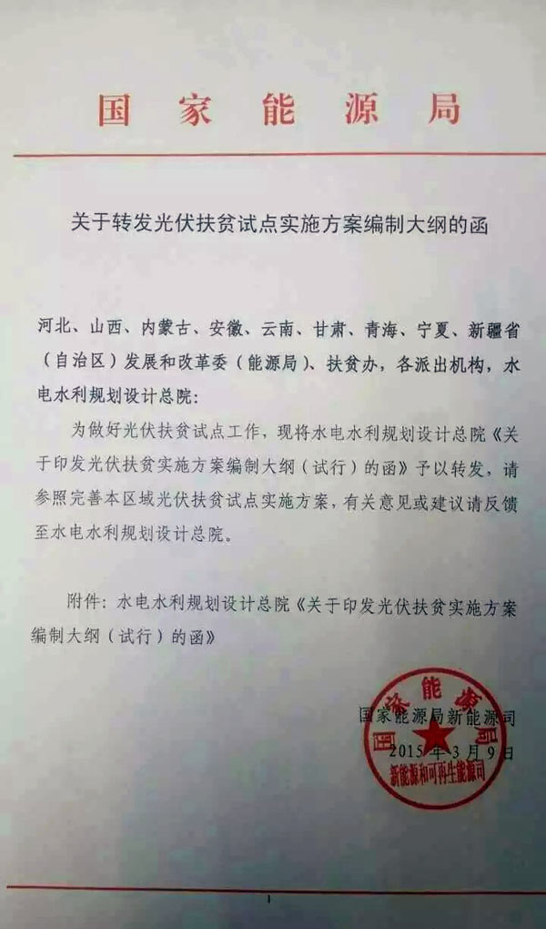 為持續推進、完善光伏扶貧工作進展,2015年3月9日,國家能源局新能源司下發《關于轉發光伏扶貧試點實施方案編制大綱的函》,為各地編制光伏扶貧實施方案提供參考依據。