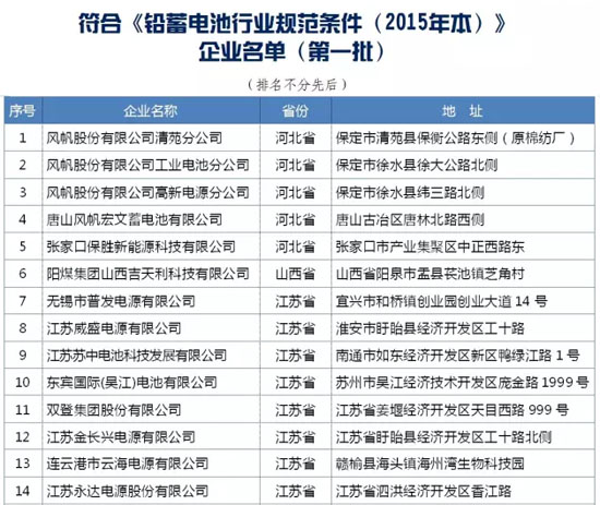 為推動我國鉛蓄電池行業可持續發展,依據《鉛蓄電池行業規范條件(2015年本)》及《鉛蓄電池行業規范公告管理辦法(2015年本)》,工業和信息化部開展鉛蓄電池行業規范管理工作。經企業申請、省級工業和信息化主管部門初審、專家審核、工業和信息化部復核以及網上公示等程序,39家企業列入《符合<鉛蓄電池行業規范條件(2015年本)>企業名單(第一批)》,現予以公告。