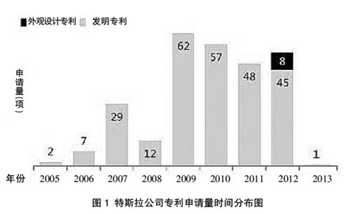 筆者使用國(guó)家知識(shí)產(chǎn)權(quán)局專利檢索與服務(wù)系統(tǒng),以申請(qǐng)人、發(fā)明人、關(guān)鍵詞及IPC(國(guó)際分類號(hào))為入口在中英文專利數(shù)據(jù)庫中進(jìn)行了檢索。檢索結(jié)果表明,截至2014年6月21日,特斯拉公司在全球范圍內(nèi)共公開了相關(guān)專利申請(qǐng)271項(xiàng),其中發(fā)明專利申請(qǐng)263項(xiàng),外觀設(shè)計(jì)專利申請(qǐng)8項(xiàng)。從圖1中所示專利申請(qǐng)時(shí)間分布的整體趨勢(shì)來看,特斯拉公司從2005年開始提交專利申請(qǐng),初期申請(qǐng)數(shù)量較少,2009年達(dá)到最大申請(qǐng)量62項(xiàng),可以看出其前期的投入在5年后才取得突破性進(jìn)展,該公司也由此贏得了最佳融資時(shí)機(jī),于2010年在美國(guó)上市。隨后該公司一直保持著較高的年專利申請(qǐng)量,每年的申請(qǐng)量均在40項(xiàng)以上。由于專利申請(qǐng)公開需要一段時(shí)間,2013年和2014年提交的專利申請(qǐng)數(shù)據(jù)目前還不能從數(shù)據(jù)庫中獲得,因此圖1中顯示的2013年和2014年申請(qǐng)數(shù)量較少。