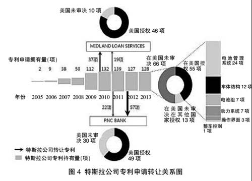 埃倫·馬斯克宣布特斯拉公司將開放所有專利技術,那么特斯拉公司真正擁有多少專利呢?筆者對特斯拉公司的專利權屬轉讓情況進行了深入檢索統計分析,發現近年來特斯拉公司對所持有專利進行了很多專利權轉讓。如圖4中所示,從INCOPAT數據庫獲知,在2010年至2012年間,特斯拉公司名下的271項專利申請中有超過135項發生過專利權屬轉讓(assignment),其中79項轉讓給了PNC銀行協會(PNC BANK,NATIONAL ASSOCIATION),56項轉讓給了米德蘭貸款服務公司(MIDLAND LOAN SERVICES,INC.),并且有20項專利申請涉及兩次權利轉讓,都是先轉給米德蘭貸款服務公司,再轉讓給了PNC銀行協會。