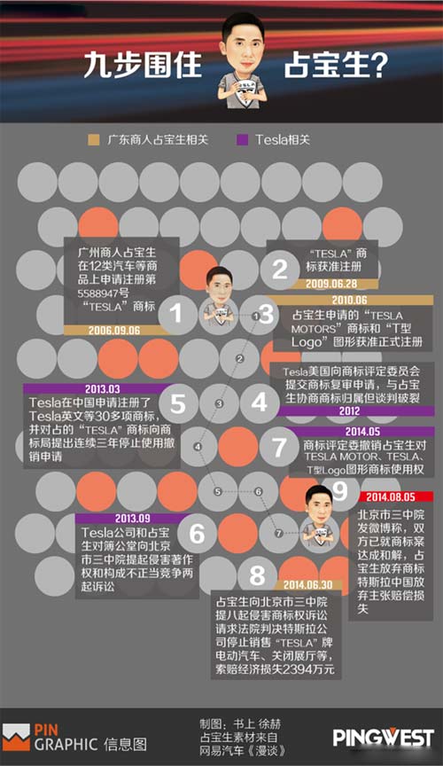 2011年以來,特斯拉一直竭力解決它在中國的商標權問題。而在經過起訴、庭審等一系列拉鋸戰后,特斯拉終于贏得了與占寶生關于商標、著作權、不正當競爭等一系列知識產權的案件。PingWest的信息圖帶你回顧,特斯拉是如何一步步圍住中國商人的。