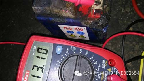 工程技術人員對被火焚燒過的電池進行一系列檢測,檢測儀器顯示電池各項檢測數據一切正常,未啟動時的電壓也達到13.10V,屬于正常范圍。面對車主及維修店人員的疑惑,技術人員進行解釋:“假如是電池導致起火,最有可能是電池內部組裝極性相反造成,但猛獅的每只電池出廠都100%通過大電流檢測,不會出現這種情況”。為進一步打消客戶的疑慮,工程技術人員檢測了電池的極性,結果顯示電池極性正常。為徹底弄清楚摩托車的啟動起火原因,工程技術人員將燒得變形的電池安裝上125cc男裝摩托車,進行數十次的點火啟動測試,電池電壓穩定在13.0V左右,負載電壓在12.3V左右,啟動性能穩定。