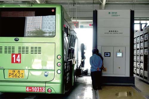 8月19日,記者在商都路汽車換電站見到了這種電動公交車。這種新型純電動公交車全長12米,純綠色流線型車身,它的強(qiáng)大“心臟”由9節(jié)大容量鋰電池組成,一次充換電續(xù)駛里程可達(dá)150公里。據(jù)介紹,這批車換電池不需要人工動手,公交車開到換電池的車間后,只需行駛到相應(yīng)軌道,換電機(jī)器人自動伸出“手臂”,將用過的電池取下,再將滿電的電池?fù)Q上。整個過程換電時間只需8至10分鐘,公交車就可以開走繼續(xù)運行了。換下來的電池,則留在充電站里充電。
