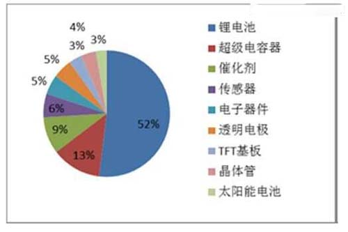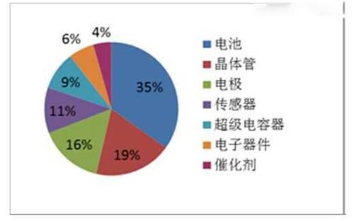 這是來自北京國之專利預(yù)警咨詢中心的數(shù)據(jù),從專利應(yīng)用分布可以看出,有鋰電(動力電池)、超級電容器、微電子、觸摸屏、催化劑、太陽能電池等。先看鋰電沒有大的突破。圖3.