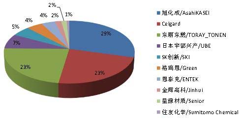 2008年全球前四大企業分別為日本旭化成、美國Celgard、日本東麗東燃、日本宇部興產,占據82.8%的市場份額。隨著國內廠商不斷加大研發和投資力度,新增產能投入運行,出貨量迅速增加,星源材質、佛山金輝高科、中科科技等大陸廠商實現隔膜產業化,其中星源材質已經與韓國LG化學、三星SDI、ATL、法國SAFT、松下能源、日本AESC等國際知名鋰離子電池生產廠商開展深入合作,開始搶占全球市場份額。
