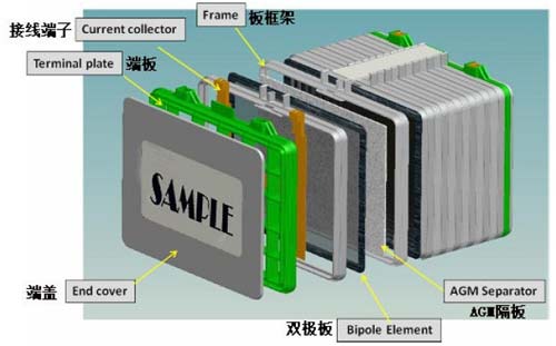 雙極性電池采用雙極性極板,板柵一面涂正極鉛膏,另一面涂負極鉛膏。具有以下優點:節鉛量可達傳統鉛酸蓄電池的50%;可減少20%的生產工序,綜合成本節約30%~40%,而且無需采用其他工藝來防止匯流排及端柱的腐蝕;活性物質分布更均勻,低電阻,能量密度、功率密度高,可以快速充電,且在循環過程中能夠明顯減緩硫酸鹽化;易于組成高電壓電池,特別是在組合100V以上高電壓的電池時獨具優勢;兼容現有鉛酸電池生產方法,80%現有鉛酸電池生產設備可用于雙極性電池;回收率可達100%。如圖3所示,Optiuma與VOLVO合作開發的采用陶瓷隔膜的雙極性鉛酸蓄電池,已安裝在本田的Insight混合動力電動車上作為動力電池,其優點是輸出功率高,循環壽命長。近幾年,中國的一些科研單位、新型材料公司、鉛酸蓄電池企業等也開始對雙極性鉛酸蓄電池及其關鍵材料進行探索。永興惠友新材料有限公司在“第十屆中國國際電池產品及原輔材料、零部件、機械設備展示交易會”上展示出了雙極性電池樣品模型(圖4)。