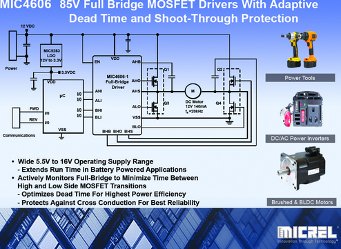近日,高性能線性和電源解決方案、局域網以及時鐘管理和通信解決方案領域的行業領導者麥瑞半導體公司 (Micrel, Inc.) 推出一款 85V 全橋 MOSFET 驅動器 MIC4606,該驅動器具有自適應停滯時間和擊穿保護功能。這款元件是麥瑞半導體最初于2013年推出的極其成功的 85V MOSFET 驅動器系列的成員,專注于滿足多種應用不斷增長的電力需求。85V MIC4606 系列是麥瑞半導體為滿足電池供電的工具、不間斷電源、無線電控制的玩具和不斷增長的無人機市場的需求而實施的策略的一部分。