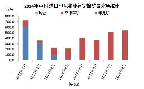 據(jù)海關(guān)數(shù)據(jù)統(tǒng)計(jì),8月份中國(guó)鎳礦進(jìn)口總量為542萬(wàn)噸,比上月增加35萬(wàn)噸,同比增加17萬(wàn)噸;其中,從菲律賓進(jìn)口量為532萬(wàn)噸,比上月增加32萬(wàn)噸,同比增加247萬(wàn)噸;從印尼進(jìn)口量為3.8萬(wàn)噸,比上月增加0.3萬(wàn)噸,同比減少232萬(wàn)噸。相比6月份的359萬(wàn)噸、7月份的501萬(wàn)噸,8月菲律賓鎳礦進(jìn)口量可謂連連增加(圖6.3)。