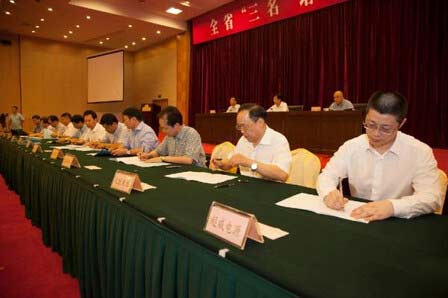 會上,周明明董事長上臺簽訂了第一批“三名”培育試點企業責任書,并作為首批試點企業代表作了表態發言。他以“推進品牌建設 爭創新能源國際化企業”為題,從實施科技創新,提升區域品牌價值、強化品牌建設,提升品牌美譽度、優化品牌管理,夯實品牌底蘊、加強國際合作,塑造國際品牌等四個方面,闡述超威將以品牌型龍頭企業為發展目標,加快四大創新,不斷整合公司產品、技術、管理、營銷等優勢,深化新能源行業電池技術研發,大力實施品牌戰略,向全球新能源行業龍頭企業的目標邁進。