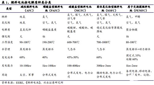 燃料電池按燃料類型可分為直接型、間接型和再生型;按電解質種類又可分為堿性燃料電池(AFC)、磷酸鹽型燃料電池(PAFC)、熔融碳酸鹽型燃料電池(MCFC)、固體氧化物型燃料電池(SOFC)和質子交換膜燃料電池(PEMFC)。