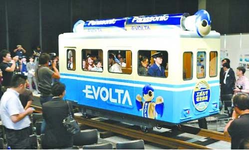 日本松下公司14日展示以干電池為動力的電車。該電車由特殊的硬紙板制成,將于11月試運行,以99節1號電池為動力,可搭載10人行駛8公里。