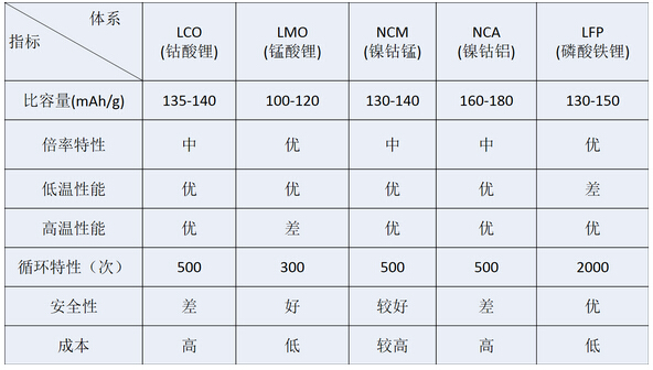 表1:磷酸鐵鋰與其他主要鋰離子電池性能對比