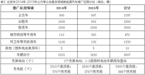 北京市計劃到2015年底在公共領域推廣應用新能源汽車8507輛,重點在公交、出租、租賃、貨運物流、環衛等領域推廣應用,在有條件的地區,推廣機場內部、大型場站內部等領域使用新能源汽車,其中推廣電動公交車1597輛、電動出租車2200輛、電動租賃車3000輛、電動物流車470輛、電動環衛車1230輛、燃料電池商用車10輛。建設充換電站3座,充電樁6748個,其中5900個交流充電樁、848個直流充電樁。