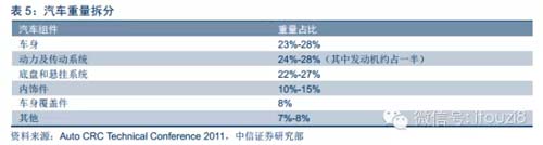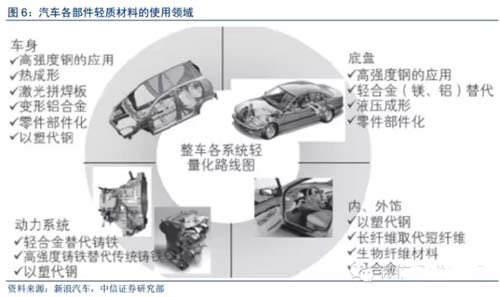 針對車身、動力系統及底盤系統的替代材料使用是目前最主要的輕量化手段。車身、動力及傳動系統、底盤和懸掛系統是汽車整備質量上的三個最主要組成部分,分別約占整車質量的1/4左右。在保證功能和安全性的基礎上,用密度更小的材料代替原有材料,是目前最有效的輕量化手段。例如,在汽車車身和底盤結構上,汽車廠商大量應用高強度鋼等材料,在提高車身和底盤強度的同時降低了車身質量;發動機的制造利用輕質合金如鎂、鋁合金代替鑄鐵,減輕了發動機質量,同時獲得了更好的發動機性能;絕大部分車型都開始將各種輕質材料引入汽車內外飾,既提升了汽車檔次,又減少了內飾耗材和重量。