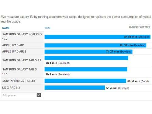這項測試由phonearena進行,用相同標(biāo)準(zhǔn)測試6款設(shè)備,三星GALAXY NotePRO 12.2續(xù)航時間8小時58分鐘,排在首位。iPad Air續(xù)航時間8小時38分鐘,iPad Air 2僅7小時27分鐘。