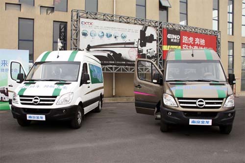 南京金龍的商務(wù)車,左側(cè)是純電動(dòng)版,右側(cè)是傳統(tǒng)燃油版。